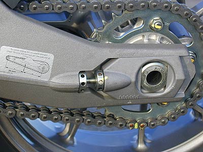 The chassis is all new. The frame is about 10% stiffer. The ergonomics are adjustable and the swingarm is now dual sided. The traditional steel trellis frame remains with Showa suspension front and back. The stylish triple trees are also adjustable for rake by using replaceable inserts. The cast, dual-sided, 15mm longer swingarm sports a nice bit of engineering trickery. The chain adjuster move parallel to the ground, not the swingarm, thus, changing gearing does not affect the rear ride height. The rear-sets can be mounted in five different positions with the shift linkage and rear brake set-up adjusting to the various locations. One item which looks adjustable but is not is the swingarm pivot. Although the inserts are removable which would allow you to raise and lower the swingarm pivot in the frame, only the top race models with have the compatible crankcases with matching removable inserts to allow for actual repositioning of the swingarm pivot.