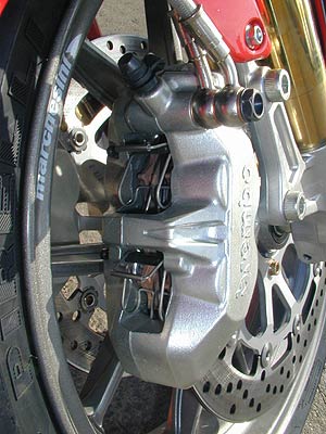 The brakes have seen some mild revisions. The calipers are the triple bridged Brembo calipers off of the 2001 “R” model with four equal sized 34mm pistons and four separate pads per caliper. The 320mm rotors are a little lighter by being thinner (4.5mm) but Ducati has spaced the rotors out further into the air stream to prevent the warping problem sometimes associated with 4.5mm rotors. The rotors have less metal (more voids in the carrier) and have one less bolt holding them to the wheel. The rear brake is slightly more powerful with an increase in the rear disc size from 220 to 240mm.